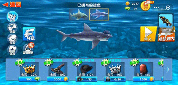礁鲨满级以后是灰鲸鲨!!就是我现在的,血槽长了,也可以下深一点的水域之中,不过还是吃吃吃吃的攻略。金币够了就赶紧进化咬合力和加速度,只有这些都加满了以后才能进化到下一个鲨鱼!每日登陆那里一定要去领,现在是金币和绿钻交替的,这两个都有解锁鲨鱼品种和技能装备的作用。
