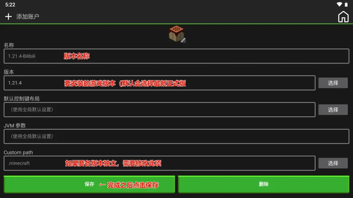 Custom path:自定义游戏路径,默认无版本隔离,如何使用版本隔离见下文