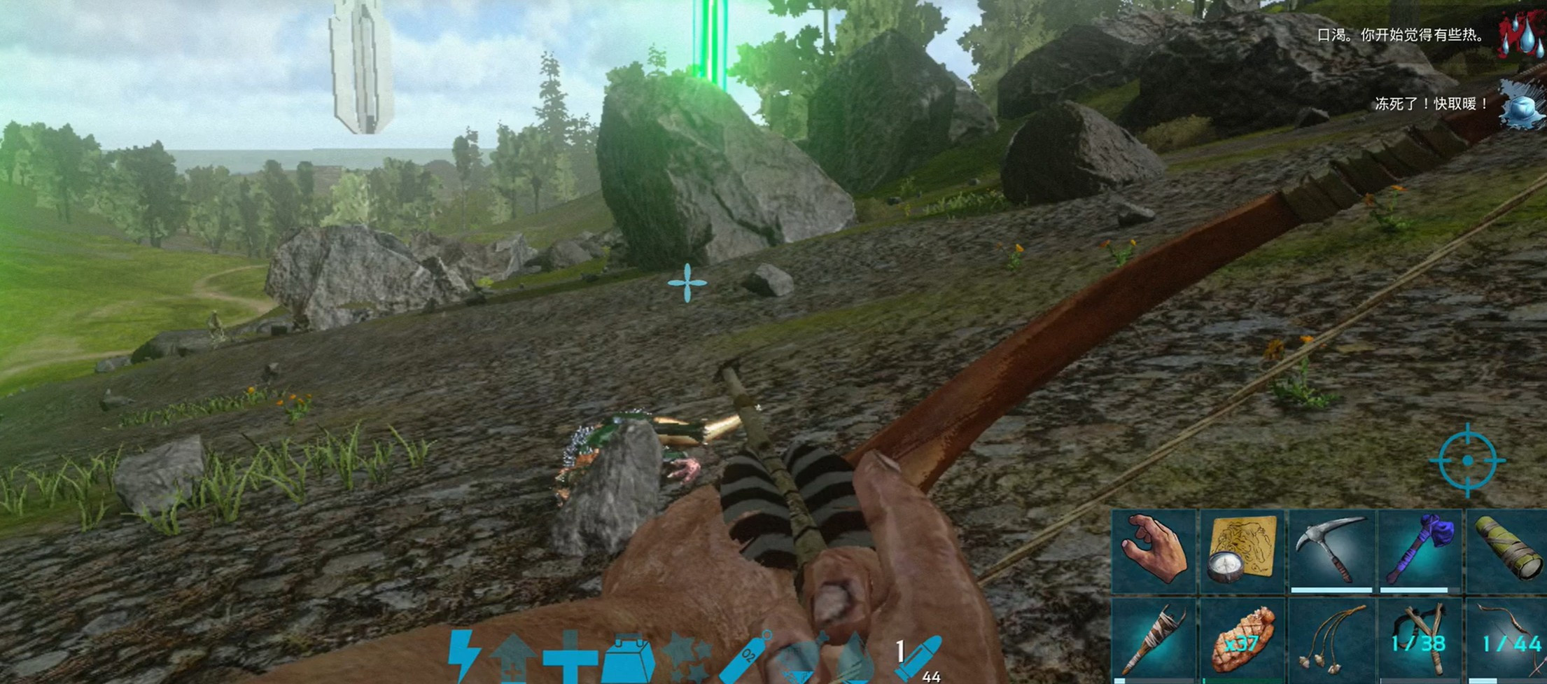 传说弓是游戏里的高级远程武器,伤害比普通弓高出不少,攻击距离也更远。不管是打野外的恐龙、防御自己的基地,还是帮忙驯服生物都很好用。使用时不用靠近怪物,站在远处就能输出,能大大减少被攻击的风险,新手后期拿到它,探索危险区域会安心很多。