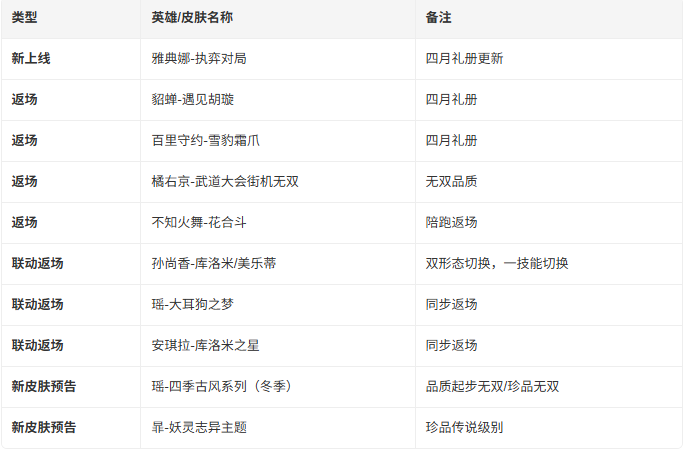 王者四月礼册即将更新,确定有多款皮肤返场及新皮肤上线,涵盖了从无双到传说级别的多种品质。